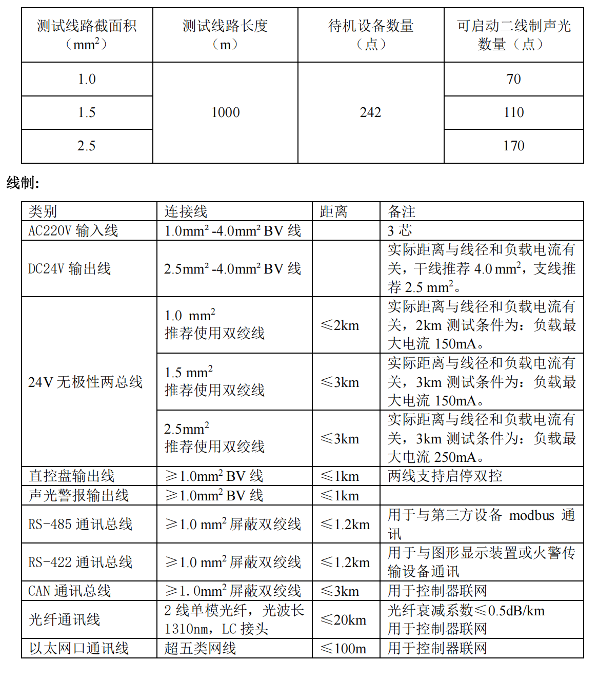下表給出不同線徑條件下 1 個回路可配接的二線制聲光警報器數量作為參考。