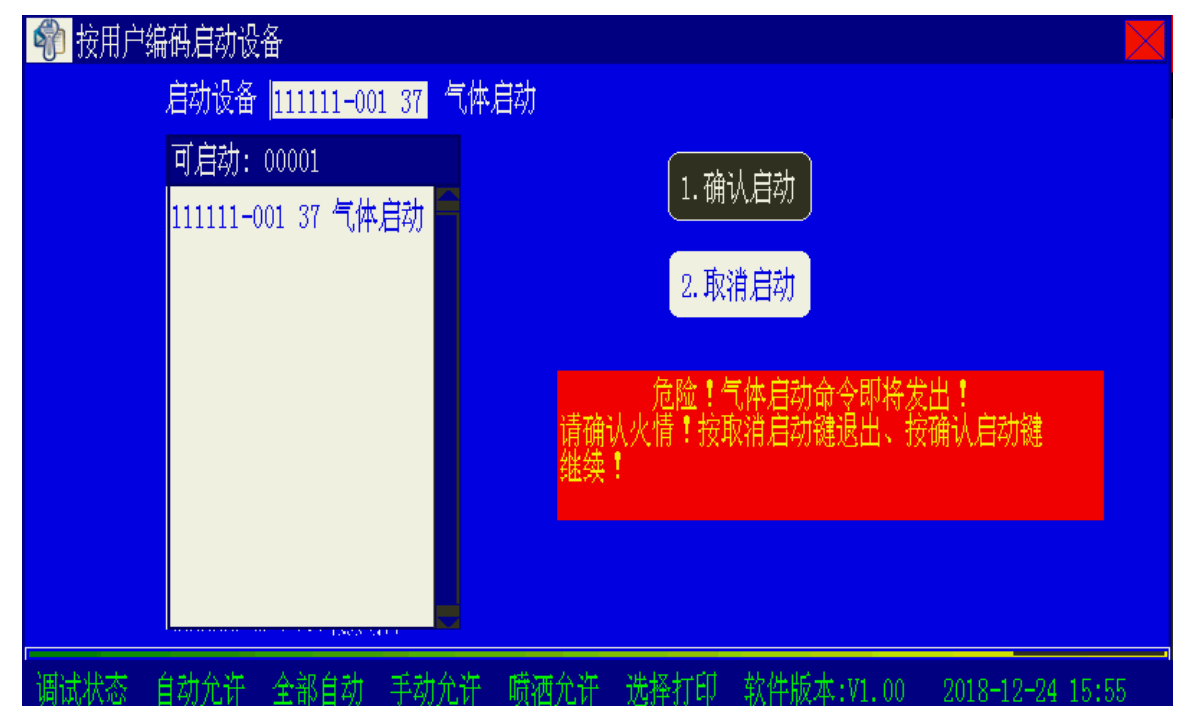 在圖2 所示界面下,選擇“取消啟動”放棄;選擇“確認啟動”控制器立即發出啟動氣體滅火設備命令!警告提示窗有時間限制,30 秒內不進行操作,放棄此次操作。